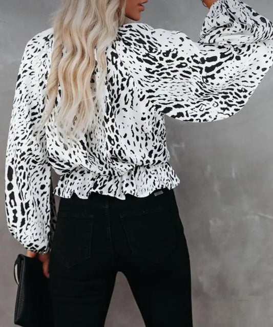 Snow Leopard Print Round Neck Ls Blouse - Warm
