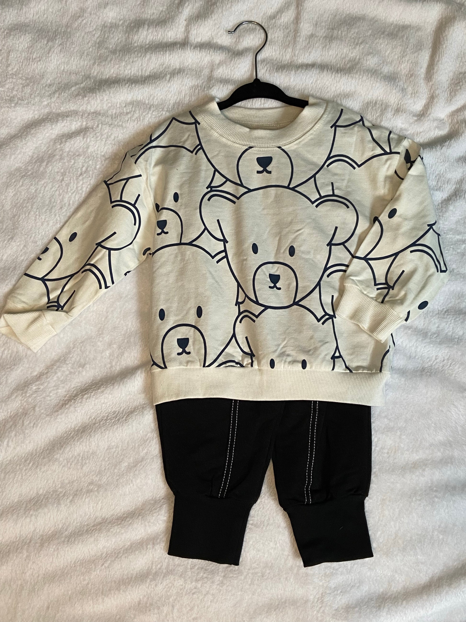2 pc outfit. Bear design top and solid navy pants.